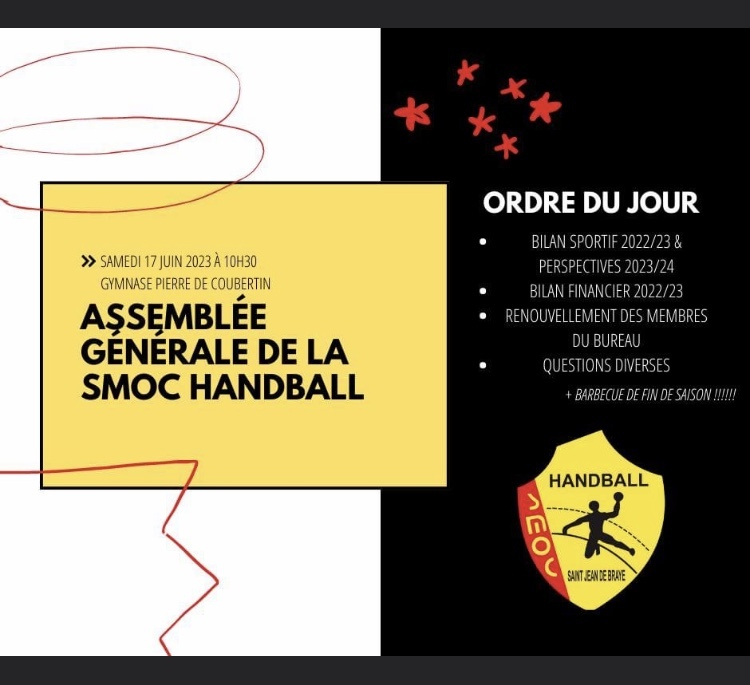 Nous vous attendons nombreux le samedi 17 juin 2023 à 10h30 pour l'Assemblée Générale de la SMOC Handball Saint Jean de Braye